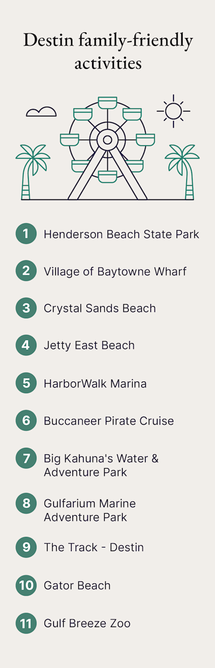 Destin is renowned for its pristine white-sand beaches, emerald-green waters and world-class fishing — it’s even referred to as the “World’s Luckiest Fishing Village.” It's a popular family vacation spot offering a mix of relaxation, adventure and family-friendly activities.