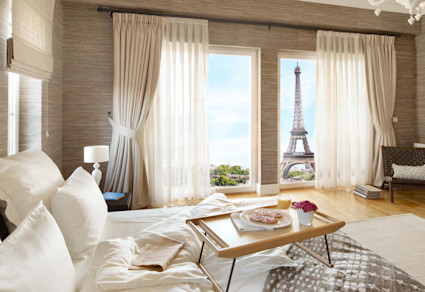 A photo shows the Eiffel Tower through a hotel room window in Paris, one of the top luxury vacation spots.