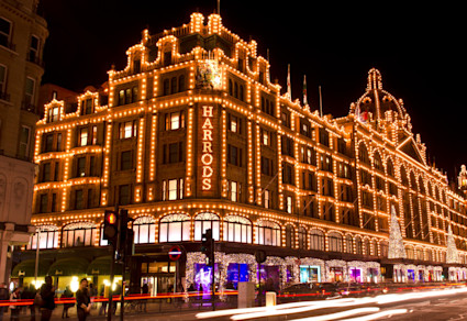 An image shows Harrods luxury department store in Knightsbridge, one of the many posh areas in London.